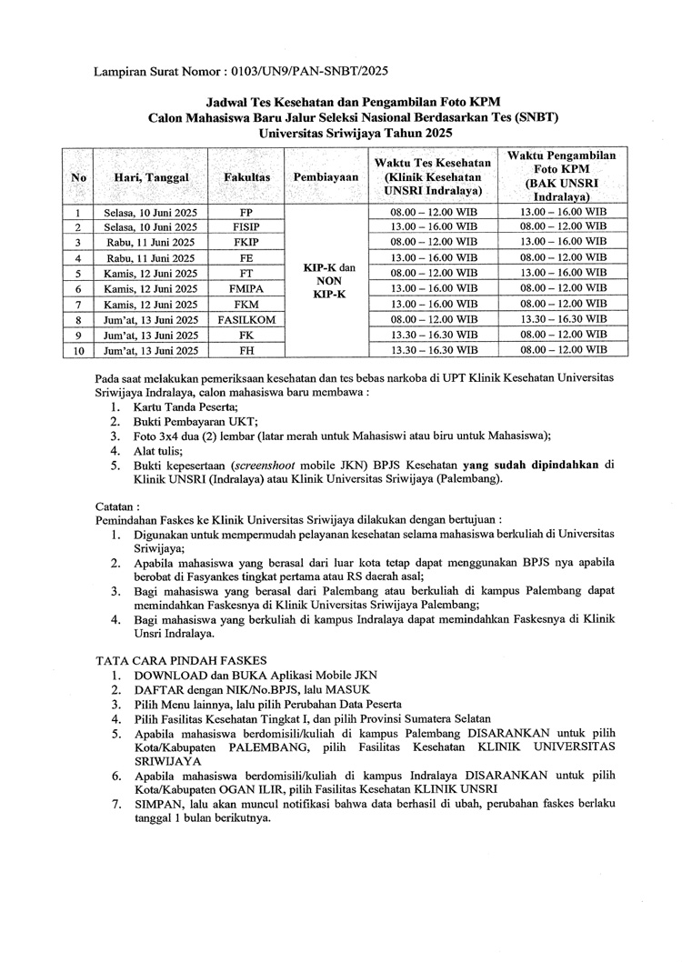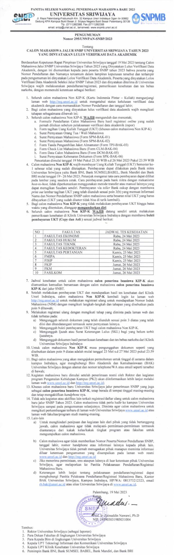 Pengisian biodata calon mahasiswa baru lulus jalur Seleksi Mandiri Jenjang Diploma dan S1 Alih Program Universitas Sriwijaya 2025 dibuka pada laman ini mulai tanggal 8 Juli 2025 pukul 09.00 WIB.