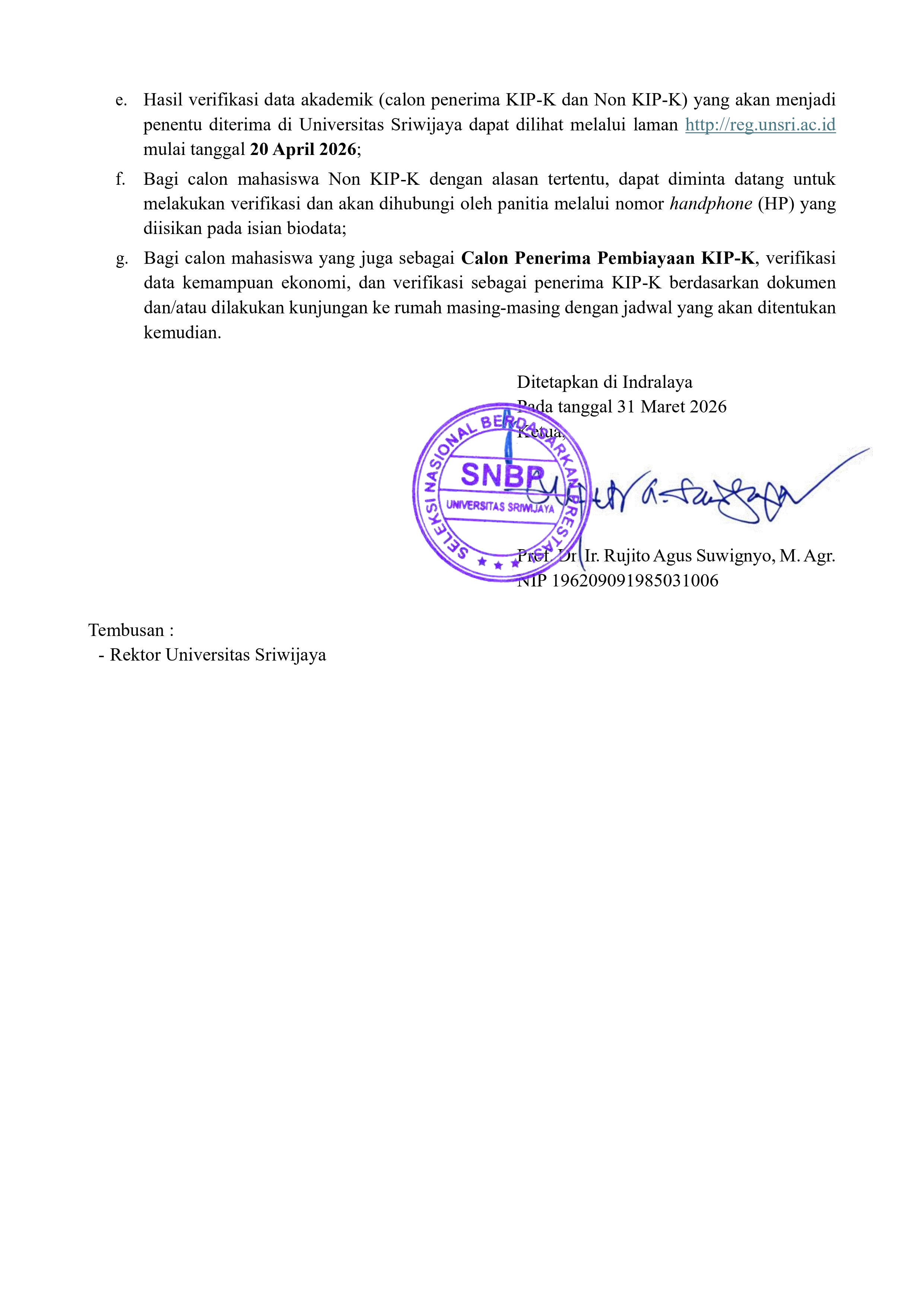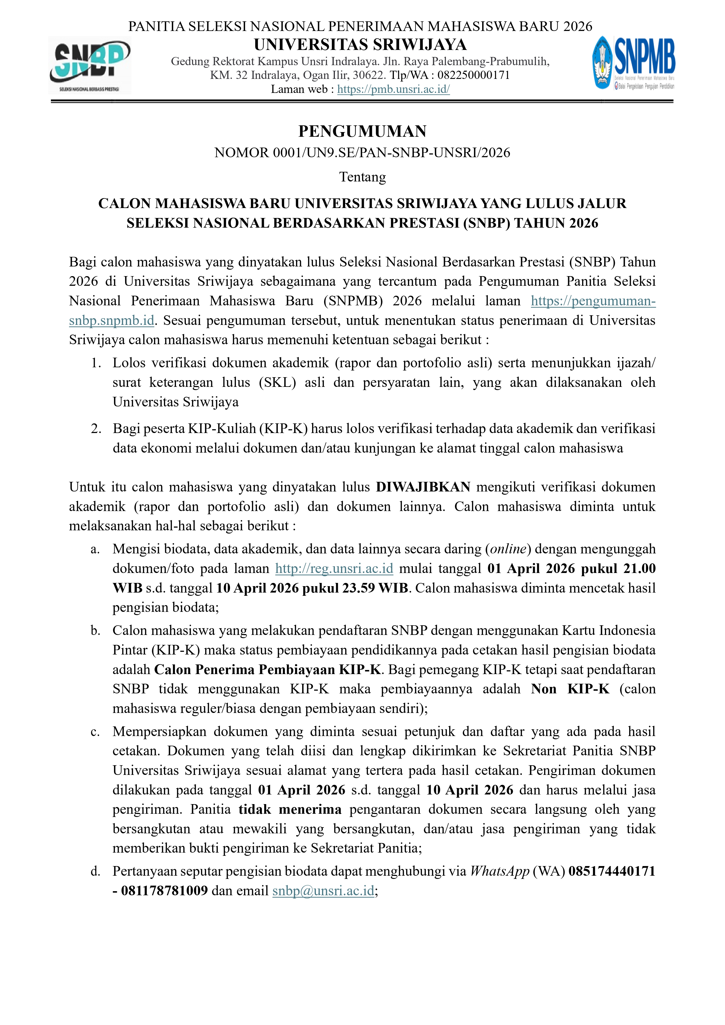 Pengisian biodata calon mahasiswa baru lulus jalur Seleksi Mandiri Jenjang Diploma dan S1 Alih Program Universitas Sriwijaya 2025 dibuka pada laman ini mulai tanggal 8 Juli 2025 pukul 09.00 WIB.